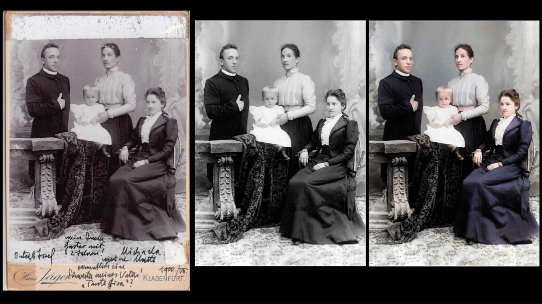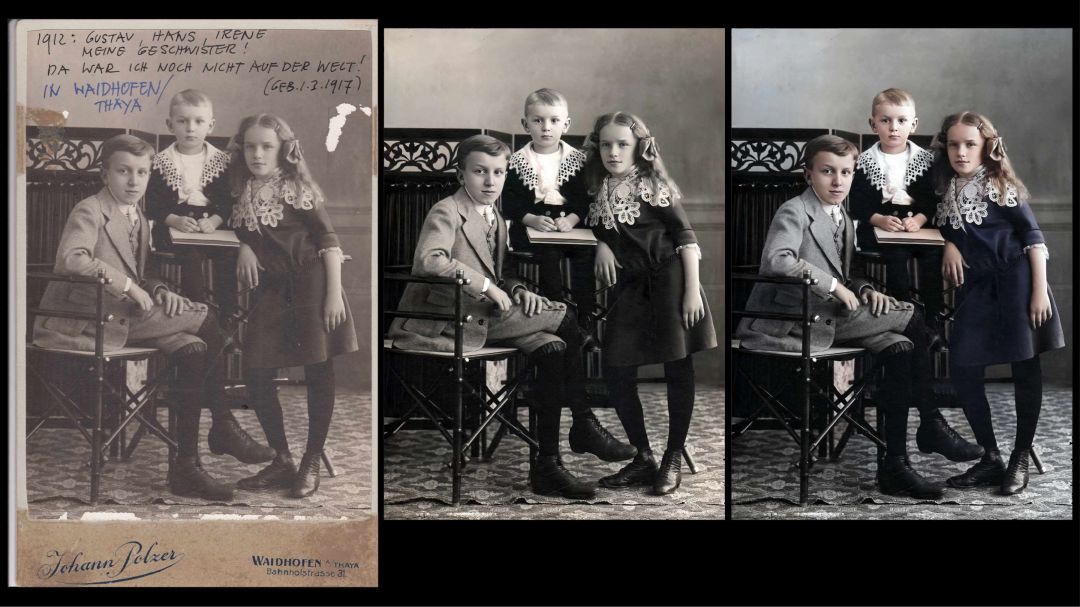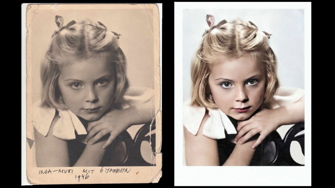 Skador som repor, fläckar, veck och mindre sprickor lagas digitalt, färger korrigeras och förbättras, kontrast och skärpa justeras varsamt för ett naturligt och tidstypiskt resultat. Kraftigt blekta eller missfärgade bilder kan återfå liv och djup, utan att förlora sin autenticitet. Svartvita fotografier kan även färgläggas på ett realistiskt och respektfullt sätt, om så önskas.
